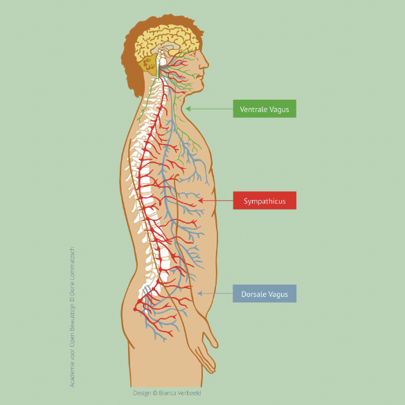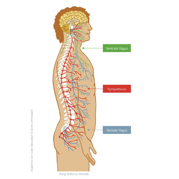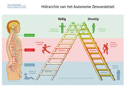 In dit set afbeeldingen vind je een aantal educatieve tekeningen van de kunstenaar Bianca Snip die het autonome zenuwstelsel in in kaart brengen. Via het model van de dubbele trap op basis van de Polyvagaaltheorie is gemakkelijk te zien, hoe ons zenuwstelsel reageert bij welzijn en veiligheid en bij stress en gevaar.